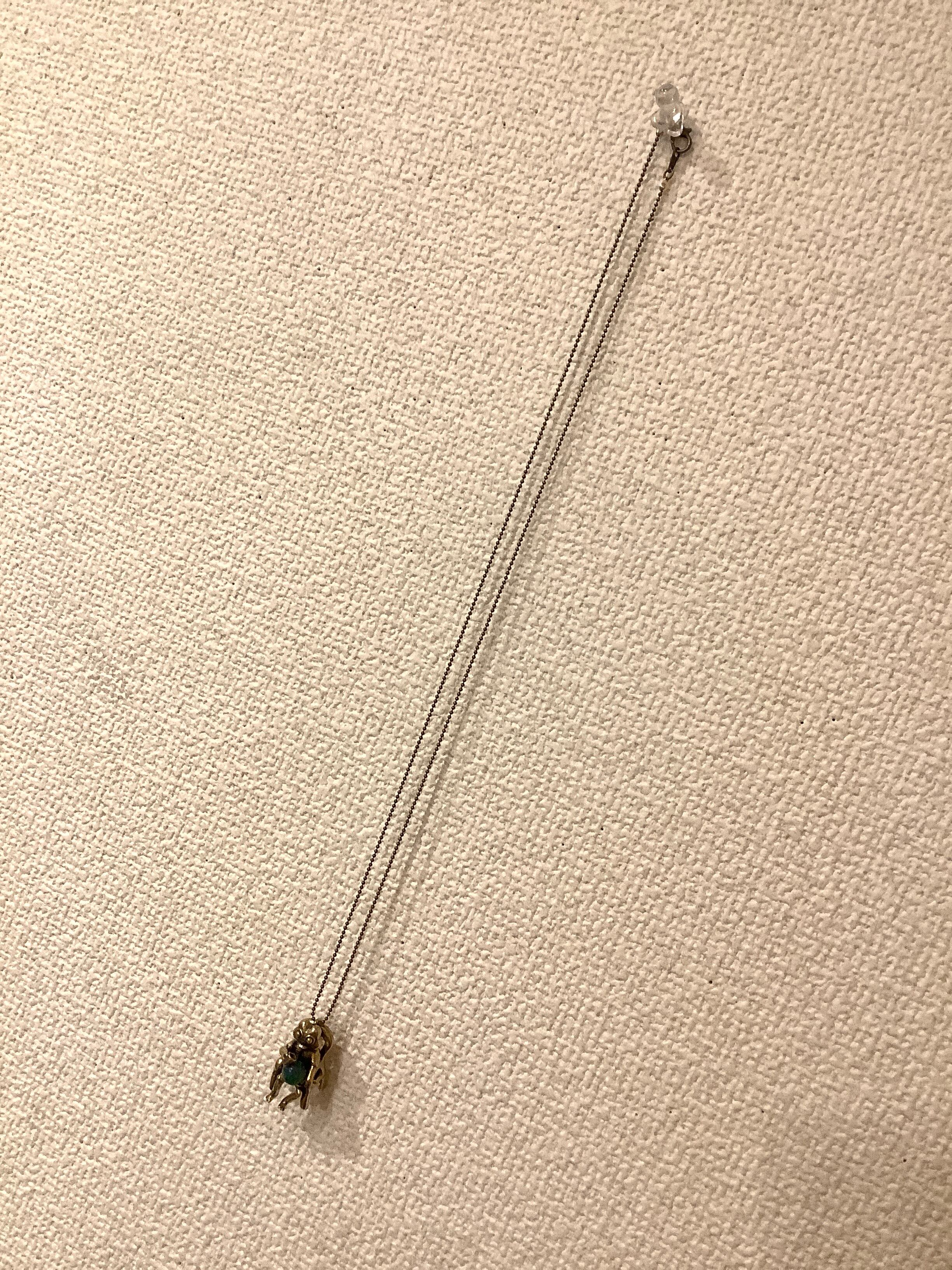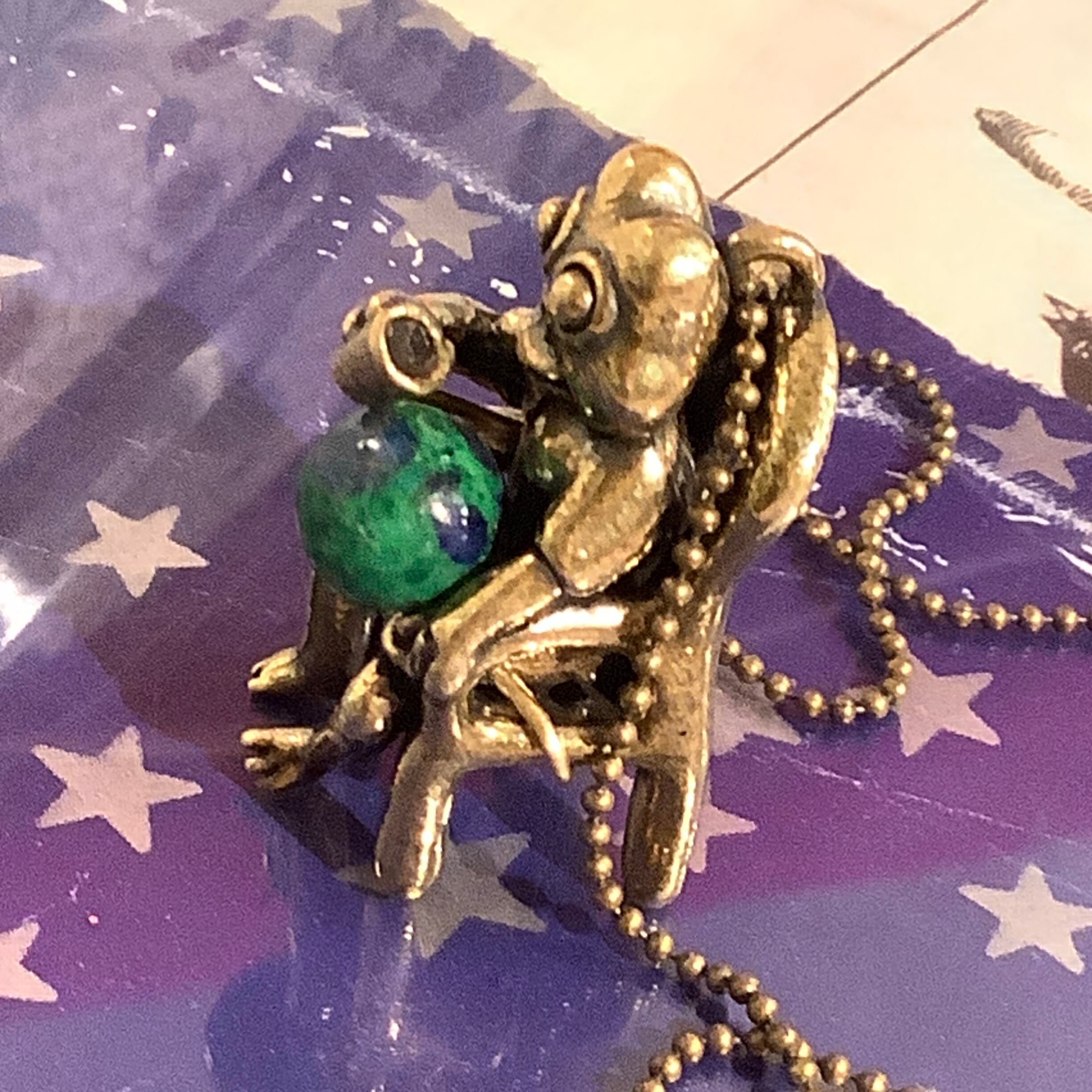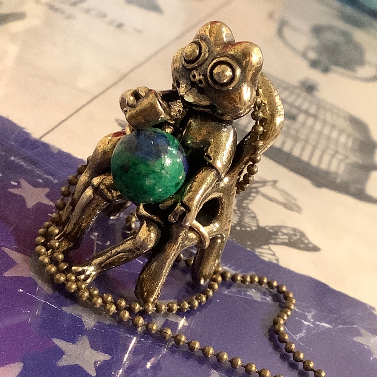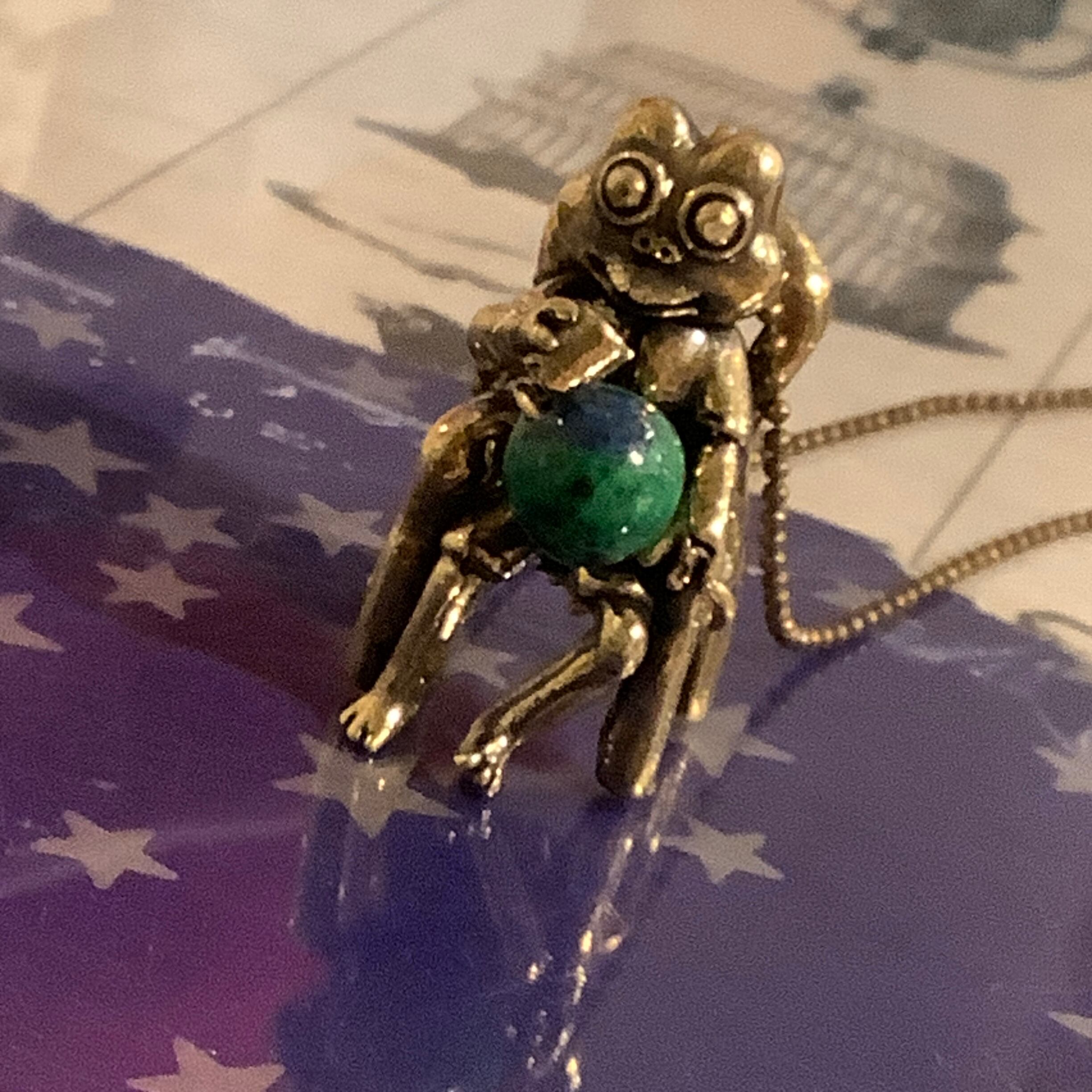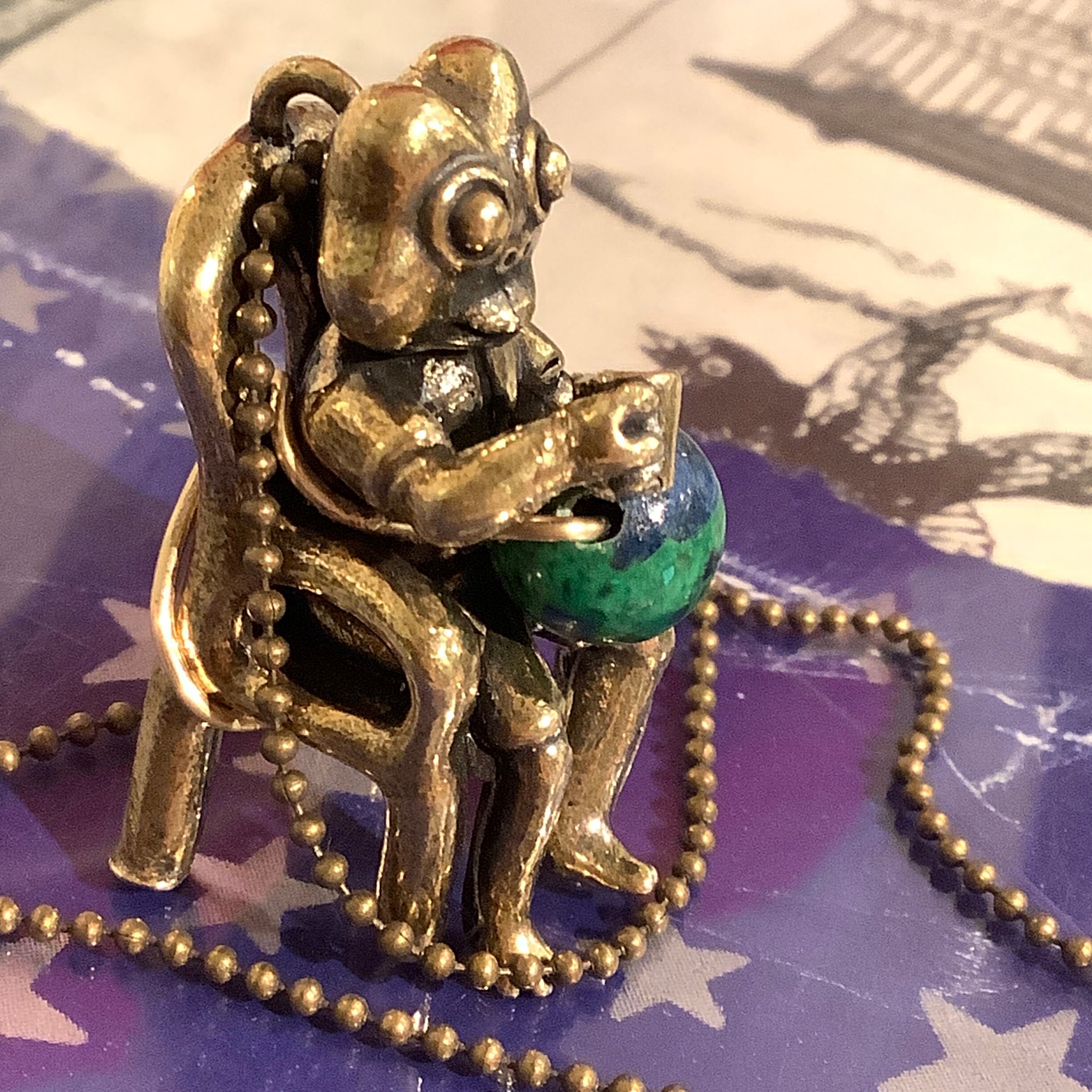 アズライトマラカイトを使用した美しい地球のような色合いの天然石を使ったペンダントで、カエルが「地球を手に入れて祝杯をあげている」という場面を想定しています。