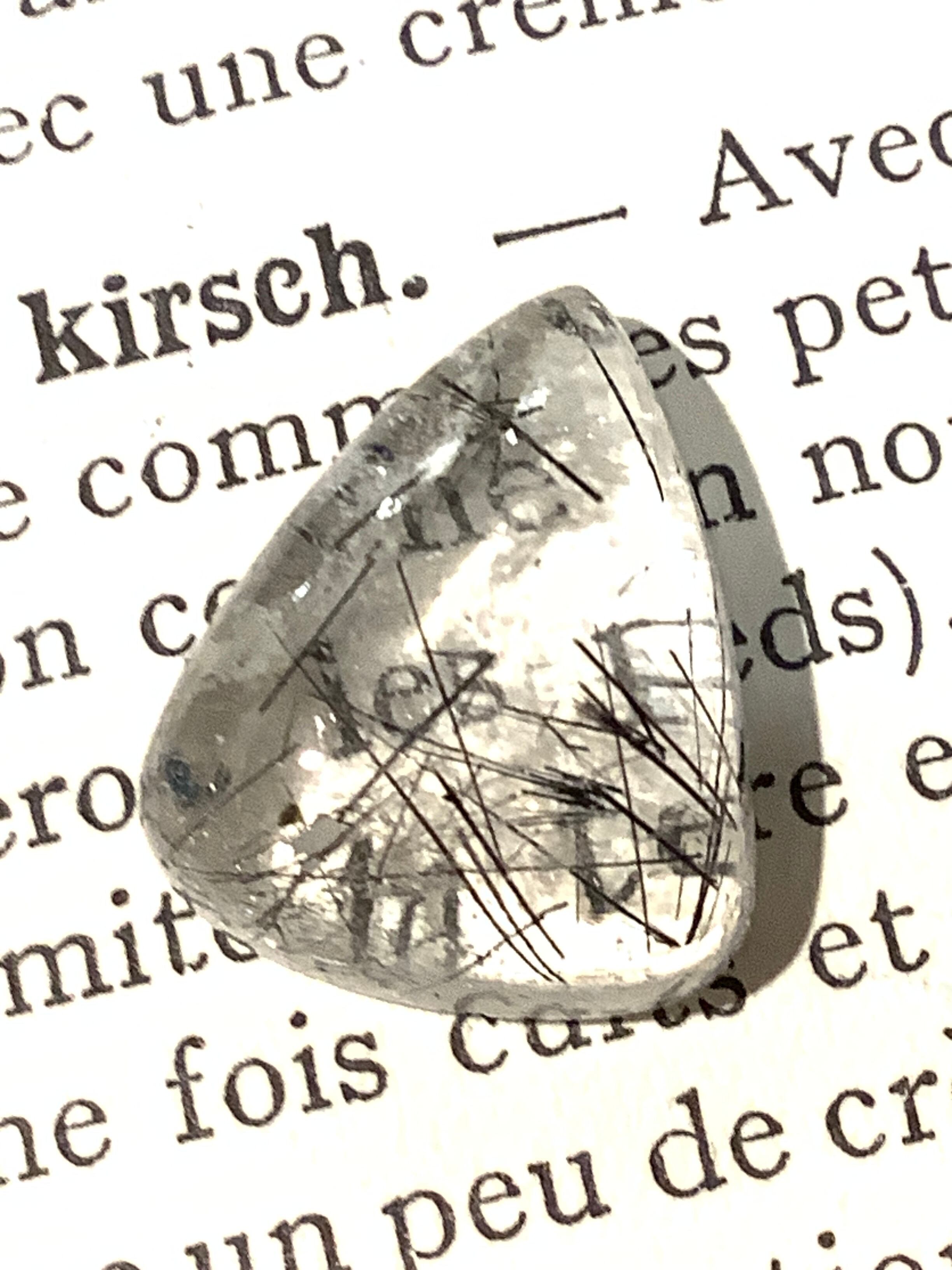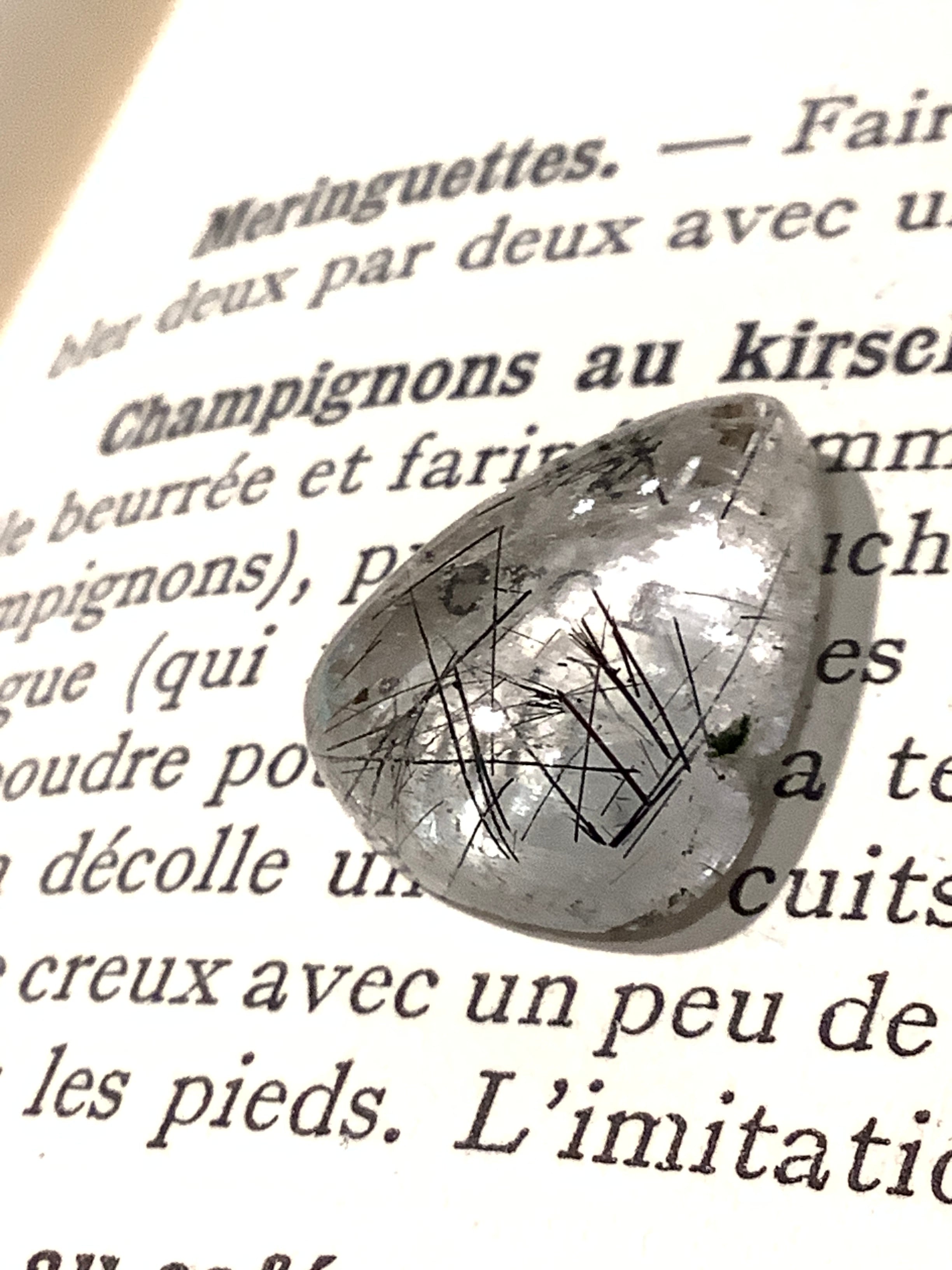 このトルマライズド クオーツは、その独特な涙型のカットが美しく、まるで水の中に髪の毛が舞っているかのような幻想的な雰囲気を醸し出します。